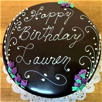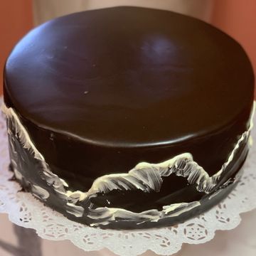 Chocolate chiffon cake, with either raspberry or apricot preserve filling, iced with chocolate butter cream with a dark chocolate ganache poured over top. Our Most Popular Item!