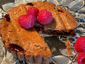 Our Linzer Torte crust is made from fresh ground hazelnuts, butter and cinnamon, then filled with red raspberry preserves from the Williamette Valley in Oregon, then topped with a lattice work crust. Rich & very traditional to Austria