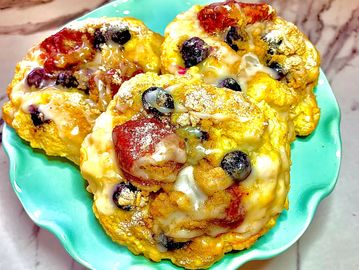 a delightful English recipe, smothered with fresh fruit in season, drizzled with icing.