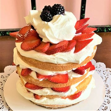 Super high layers of vanilla chiffon cake, brushed with a splash of Kirsche cherry brandy, with layers of whipping cream and select (in season) berries in between - very impressive!