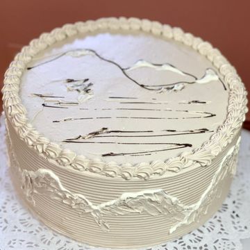 Vanilla chiffon cake, brushed with coffee liquor, filled with white chocolate ganache, covered with light mocha butter cream with a hint of cinnamon, finished with white chocolate pieces on the sides.